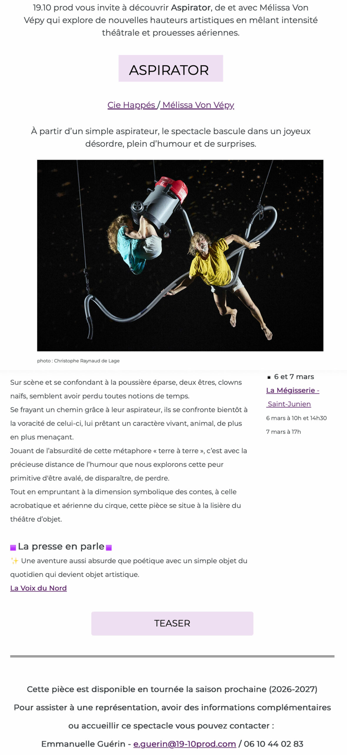 19.10 Prod se positionne comme un pôle de services dans le domaine du spectacle vivant. Nous accompagnons les équipes artistiques dans leurs projets de création et de structuration, de développement et de partenariat. Nous assurons les missions d’administration, de montage de production, de diffusion pour vos projets artistiques.